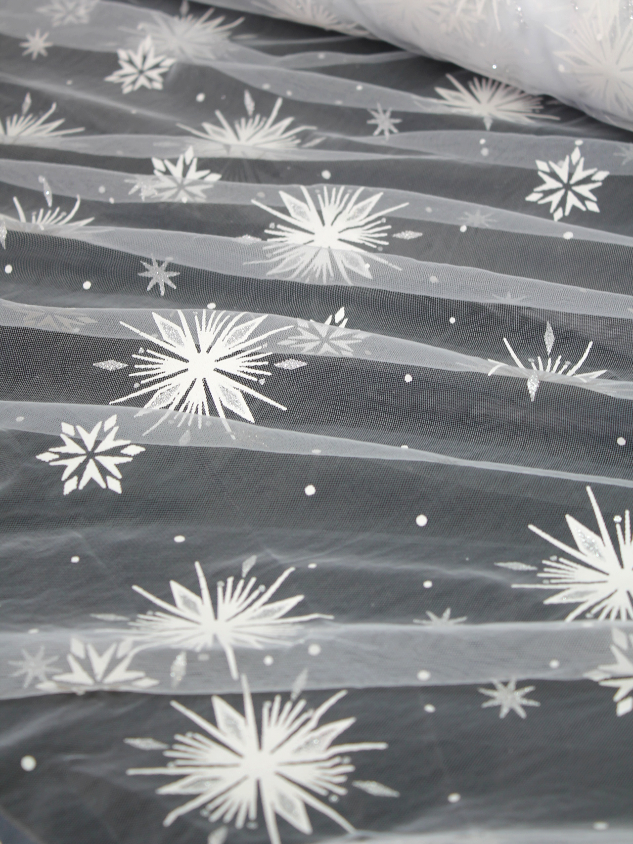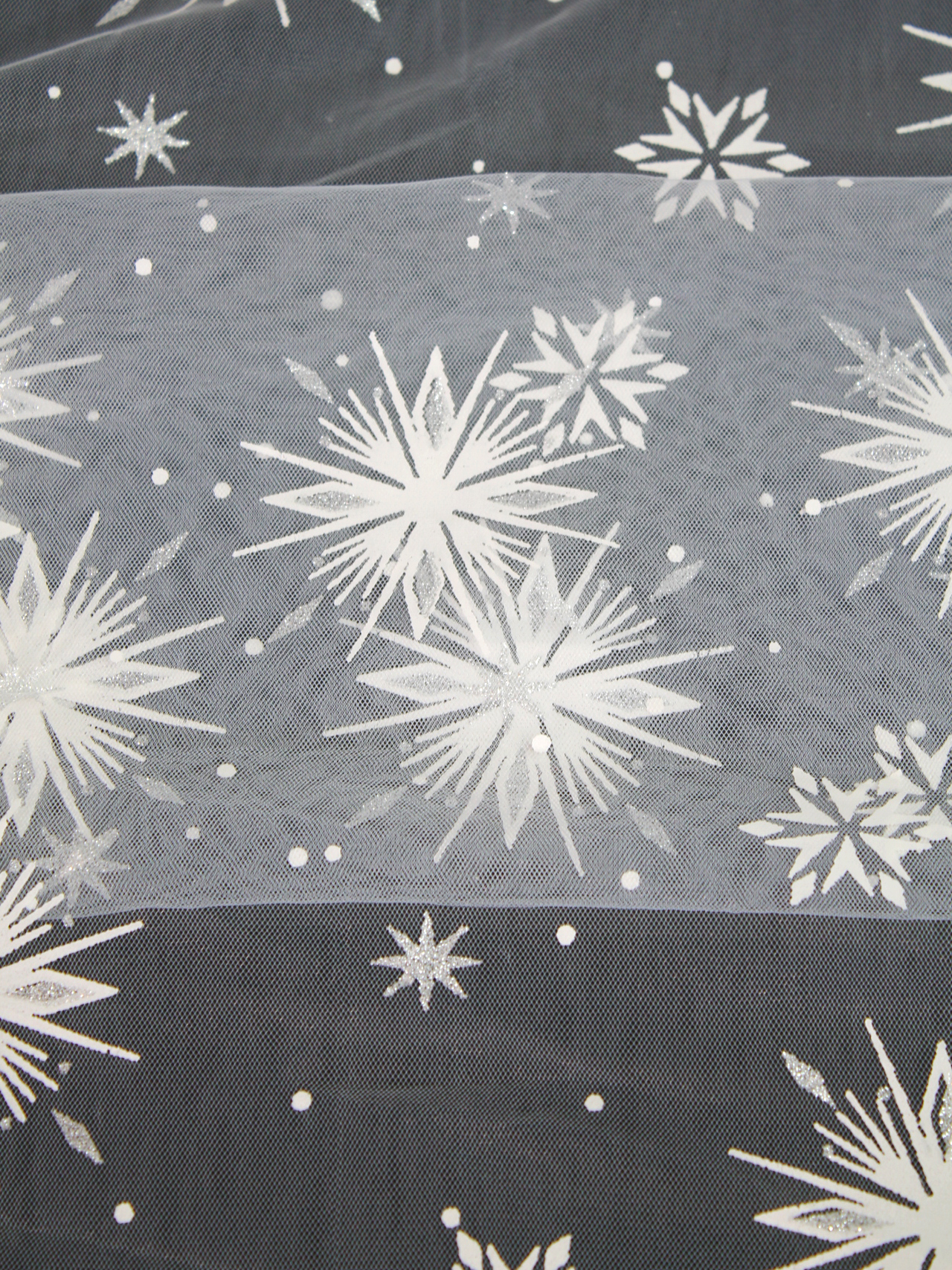 Сетка фатиновая фольгированные снежинки салют белый 1х1.5м. Цена за 1м погонный.