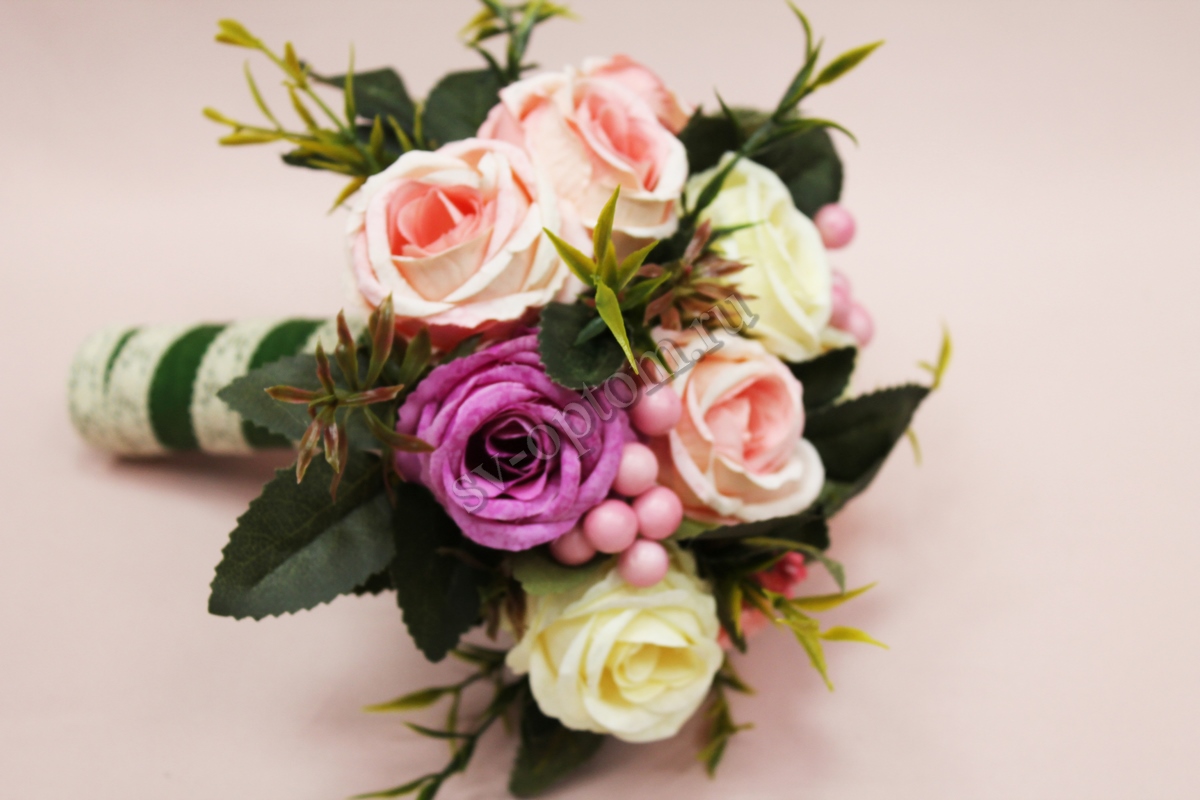 Букет дублер для невесты с розовыми, фиолетовыми и айвори розами арт. 020-030